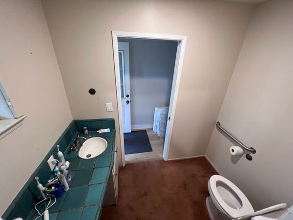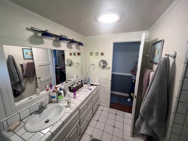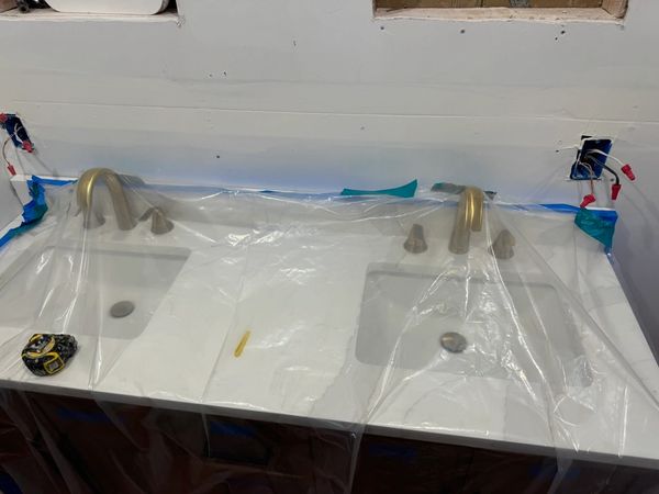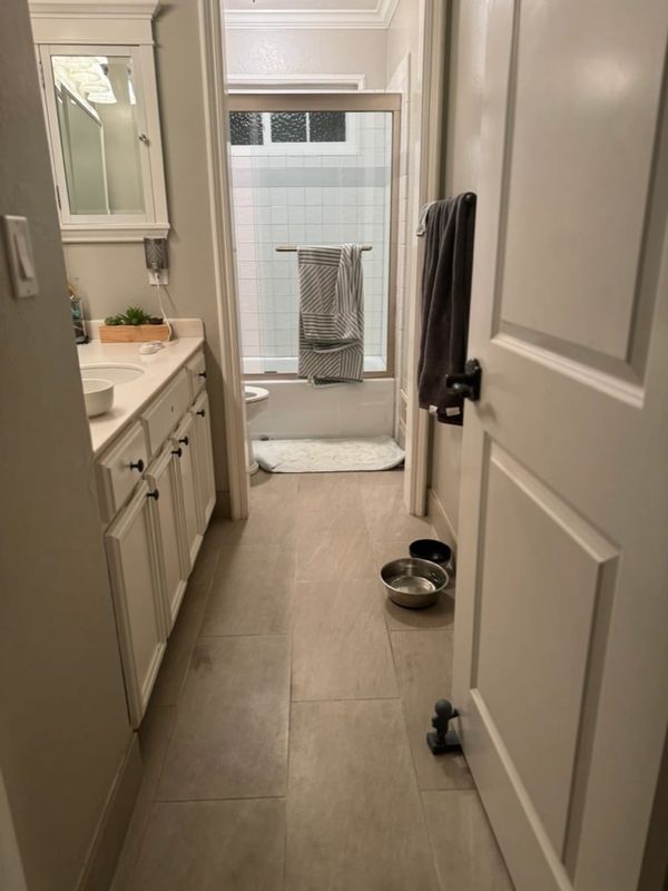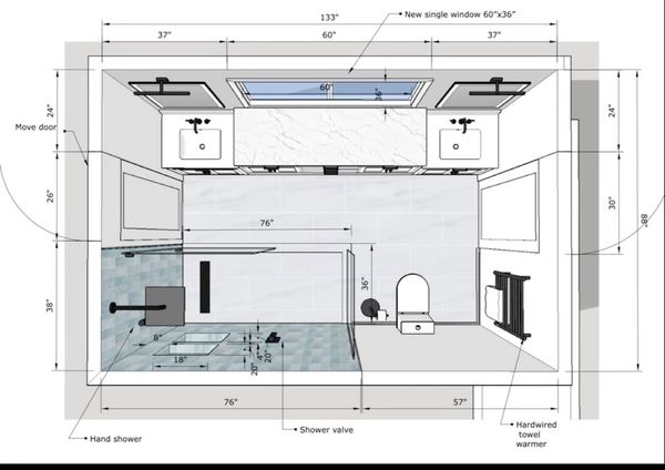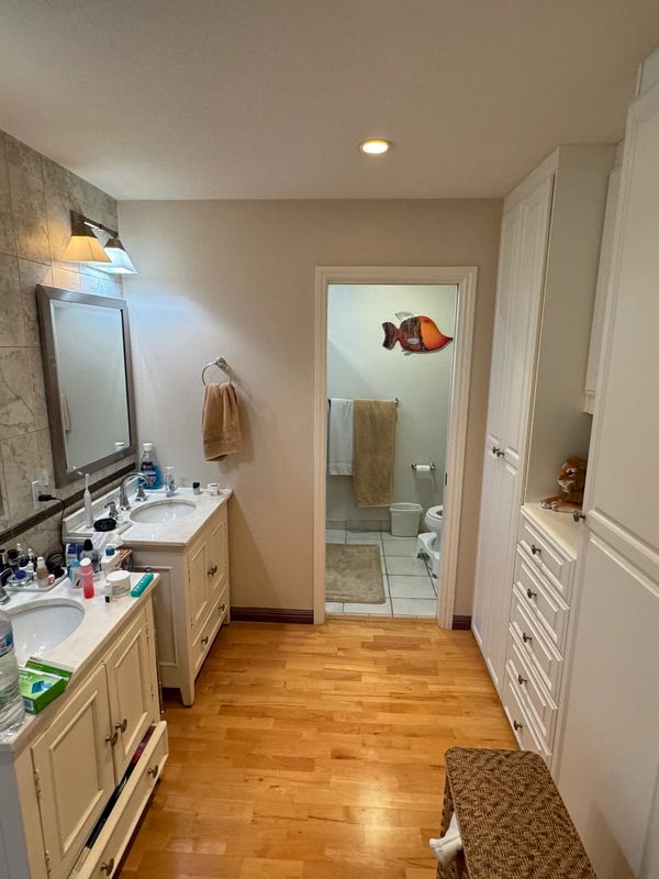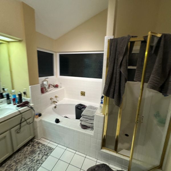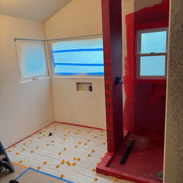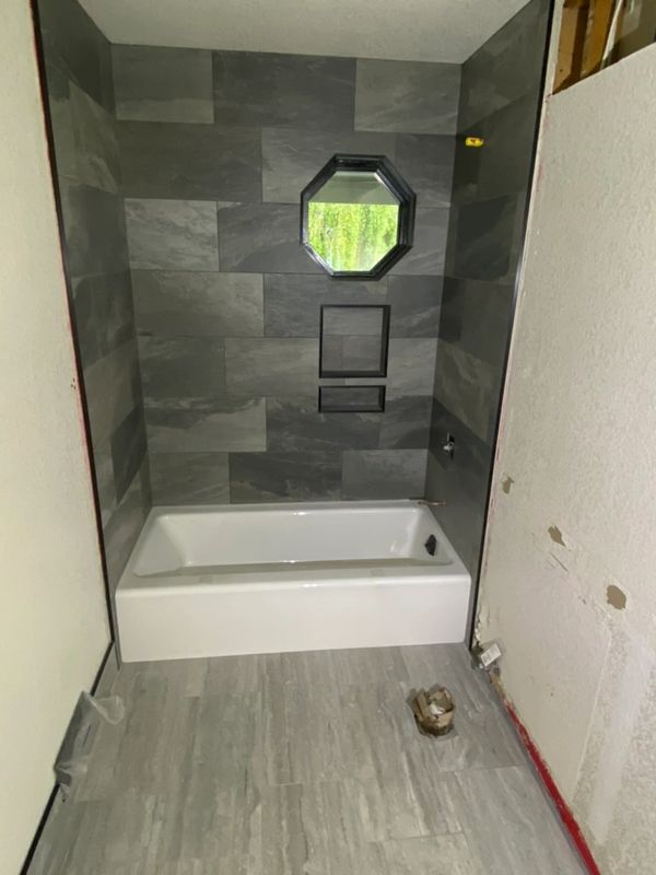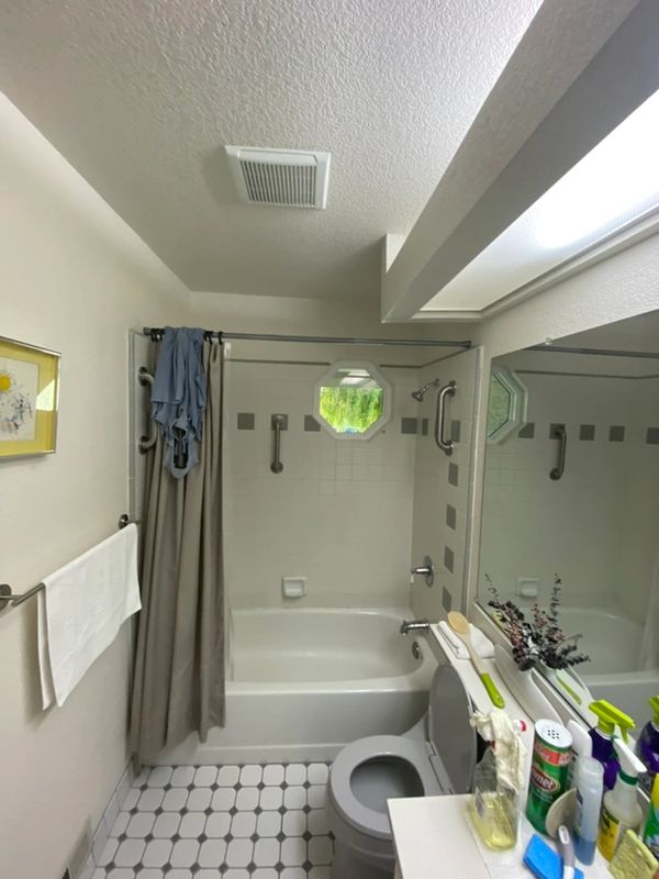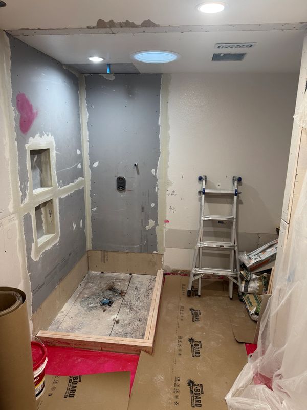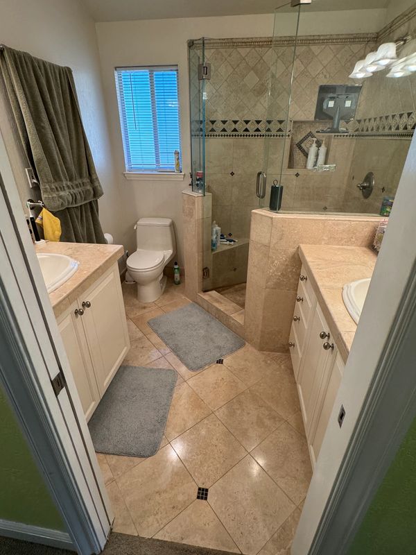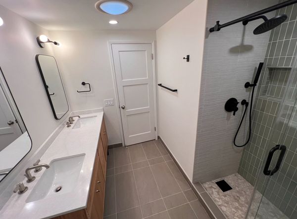 Full gut of the bathroom and replacement with new fitments, floor and shower tile, new tub, wi-fi control switches, tall vanity and toilet to accomodate for tall person and reinforced countertop for extra support