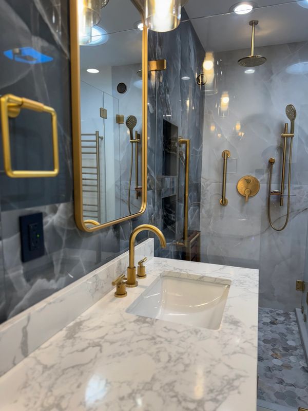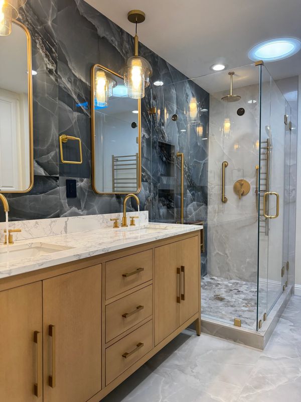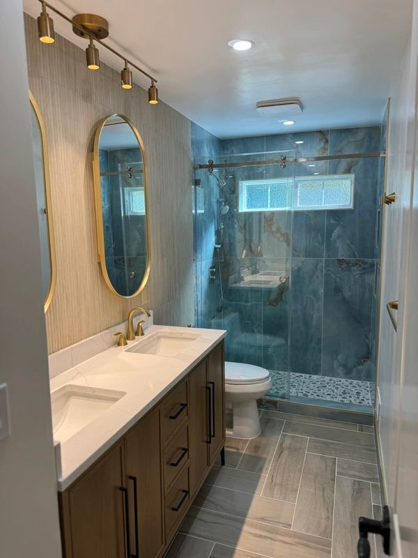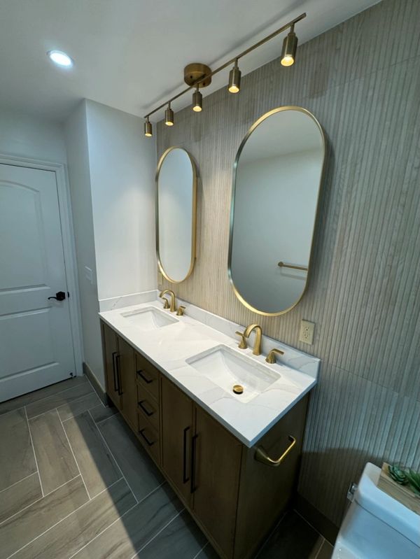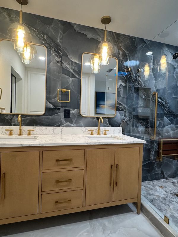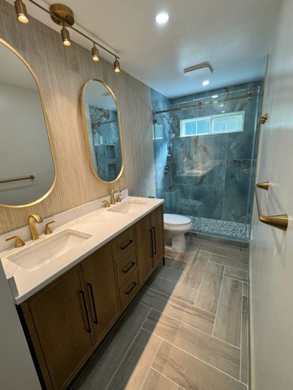 This final image captures the essence of the entire remodel: modern, refined, and thoughtfully designed. From the soft backlit mirrors to the clean floating vanity and brass accents, every detail reflects a harmonious blend of style and function. A true showcase of contemporary elegance.