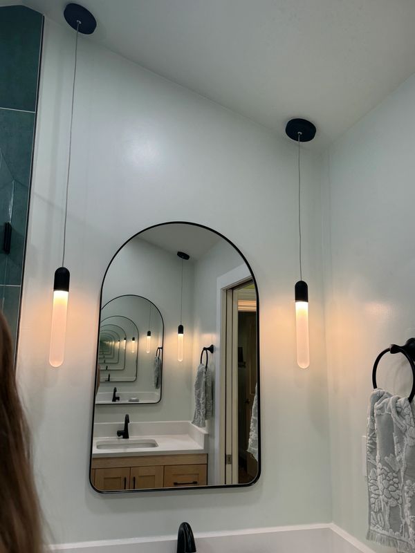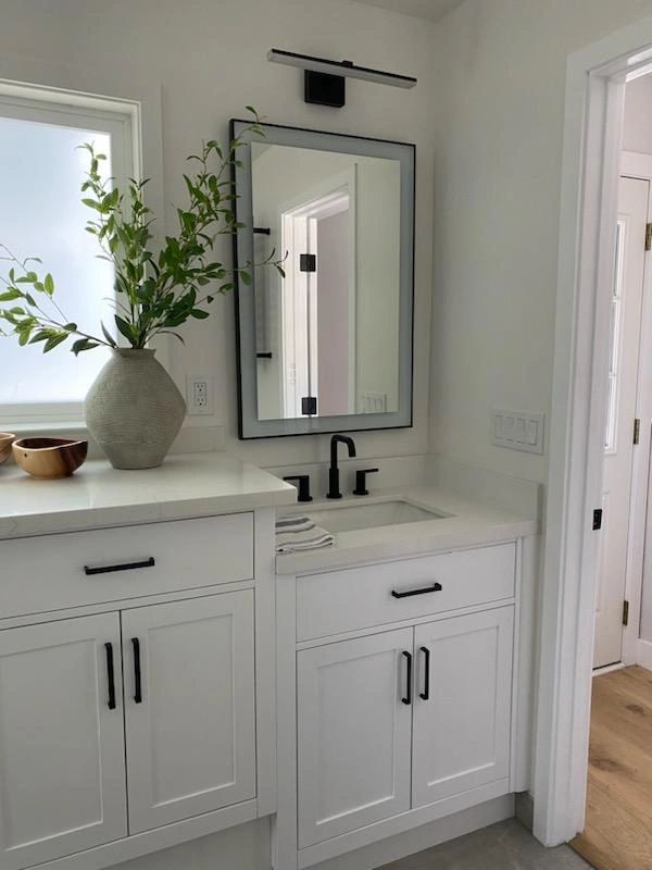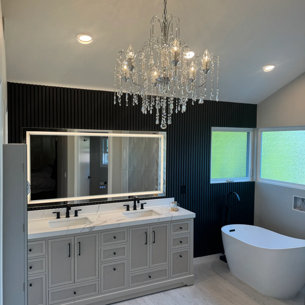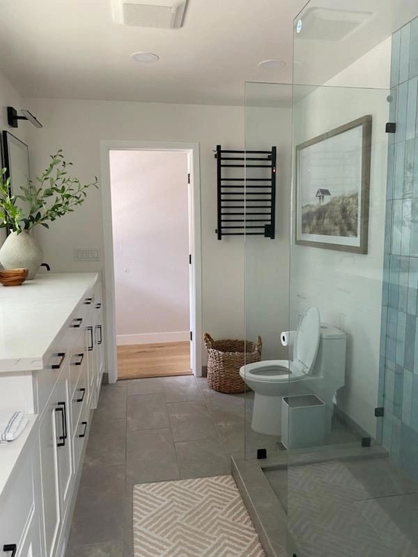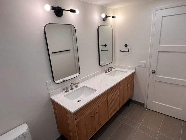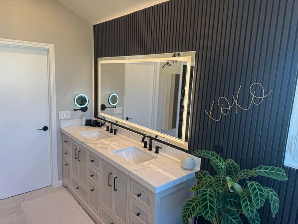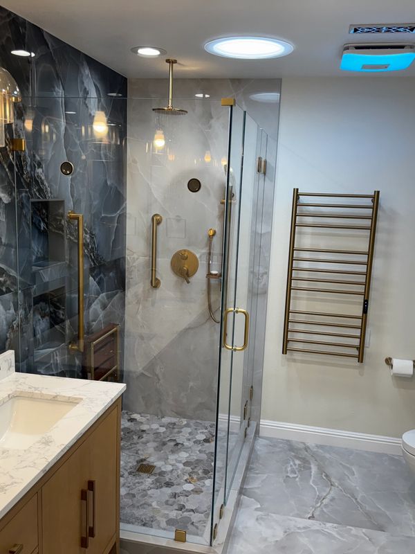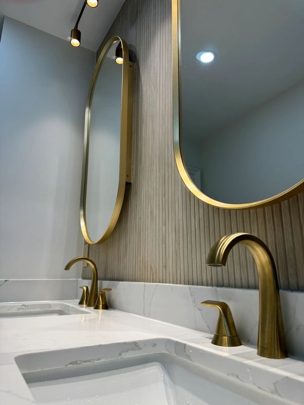 This final image captures the essence of the entire remodel: modern, refined, and thoughtfully designed. From the soft backlit mirrors to the clean floating vanity and brass accents, every detail reflects a harmonious blend of style and function. A true showcase of contemporary elegance.