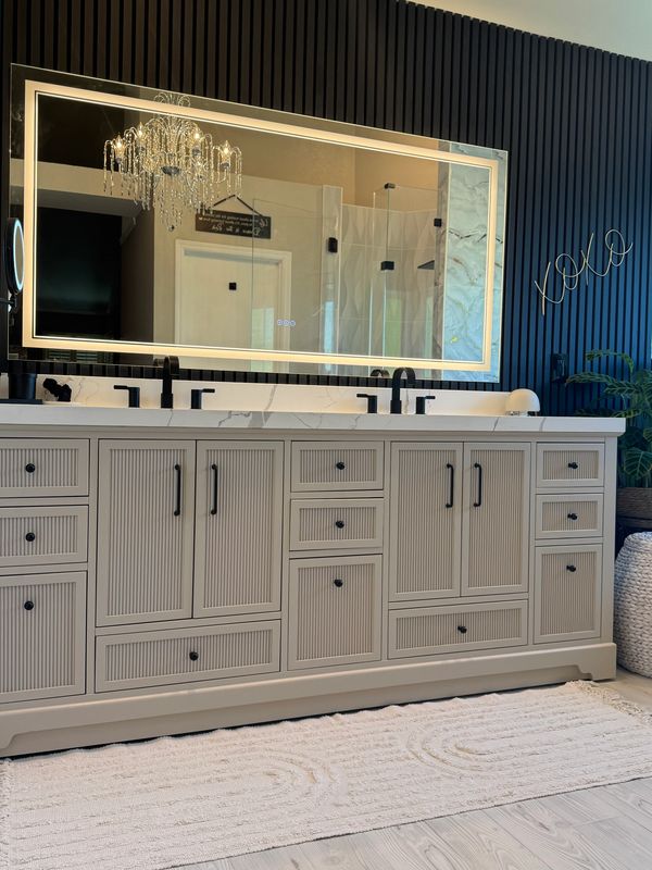The reeded cabinet fronts echo the vertical lines of the slat wall, while the illuminated mirror and chandelier add a touch of luxury to this thoughtfully layered design