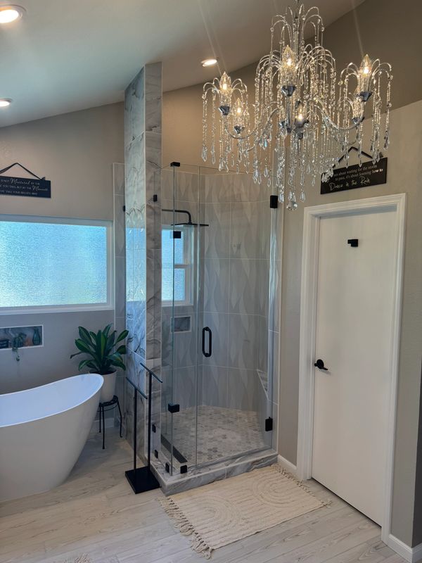 A freestanding tub and glass-enclosed shower sit beneath a dazzling crystal chandelier, balancing softness and sophistication with textured tile, soft lighting, and thoughtful finishes