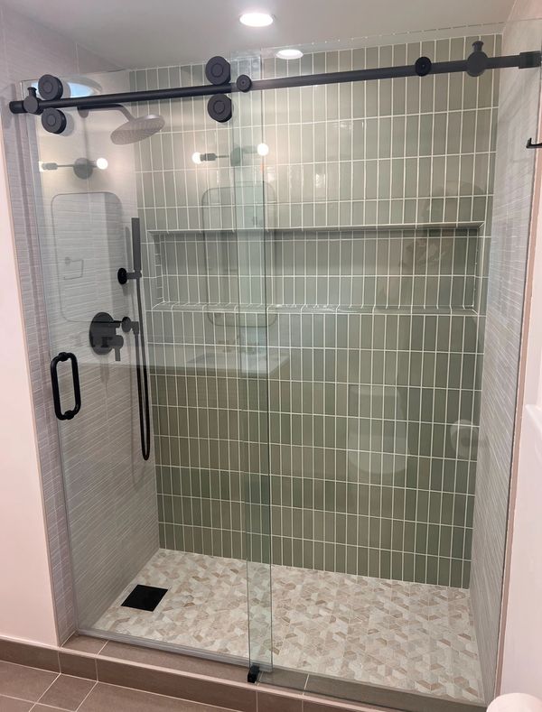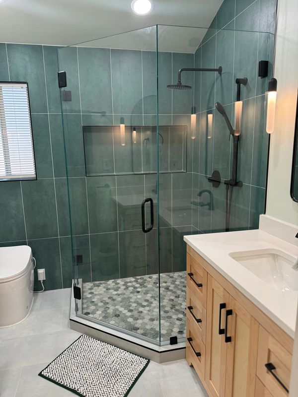 The frameless glass shower enclosure enhances the openness of the room, while matte black fixtures bring a modern edge. Bold green tiles add a refreshing, nature-inspired vibe to the space.